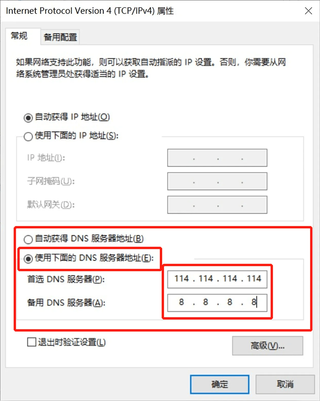 勾选 “使用下面的 DNS 服务器地址”。输入图中 DNS 服务器地址即可。