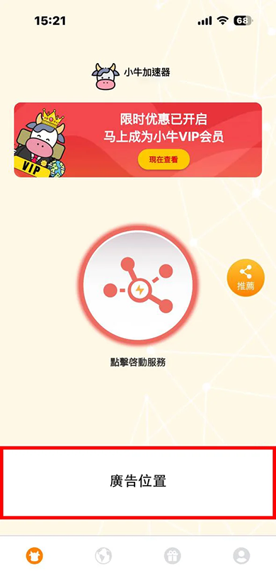小牛加速器為全球用戶提供免費 VPN 服務。為了涵蓋免費位置的伺服器成本,我們在應用程式內為免費用戶提供廣告,如下截圖所示。
