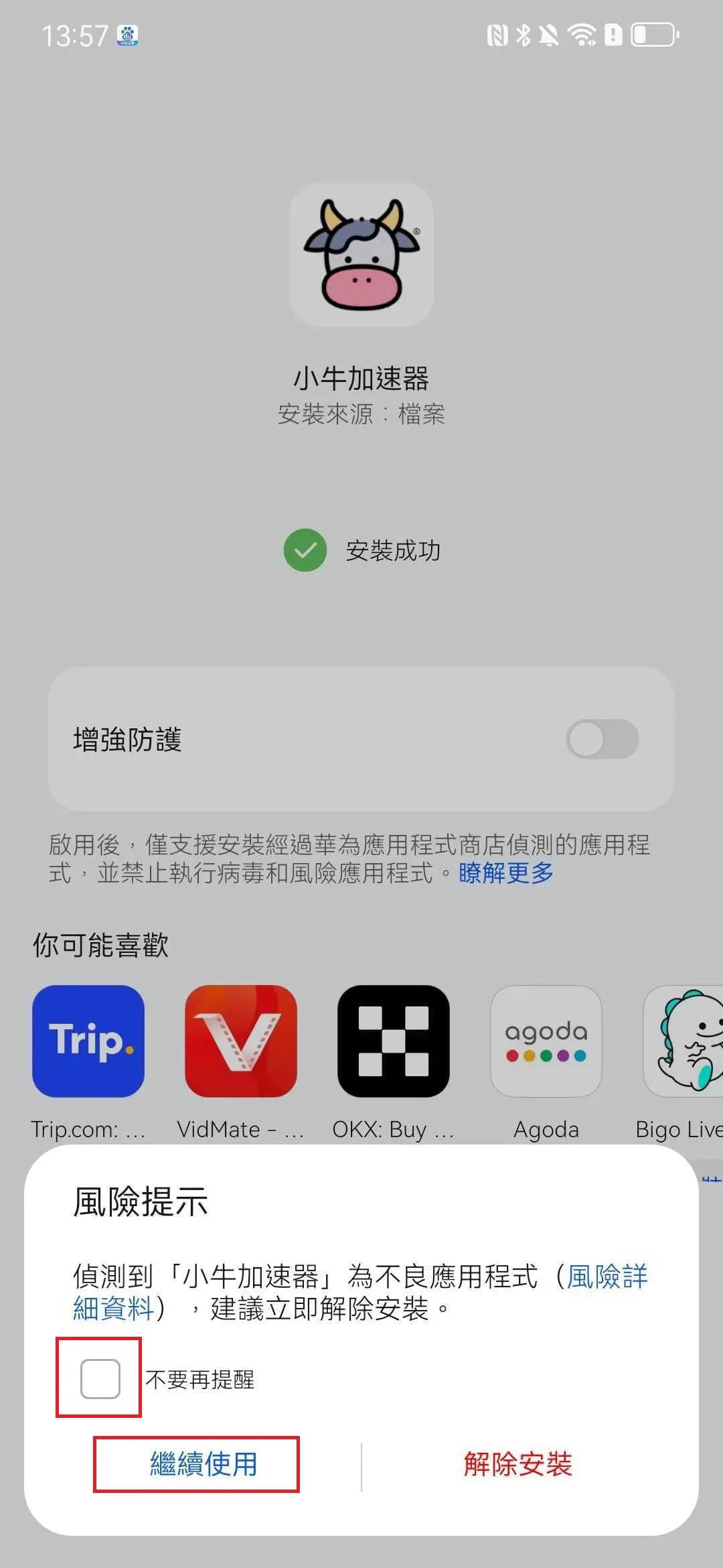 在風險提示頁面,勾選「不再提示」,並點擊「繼續使用」。